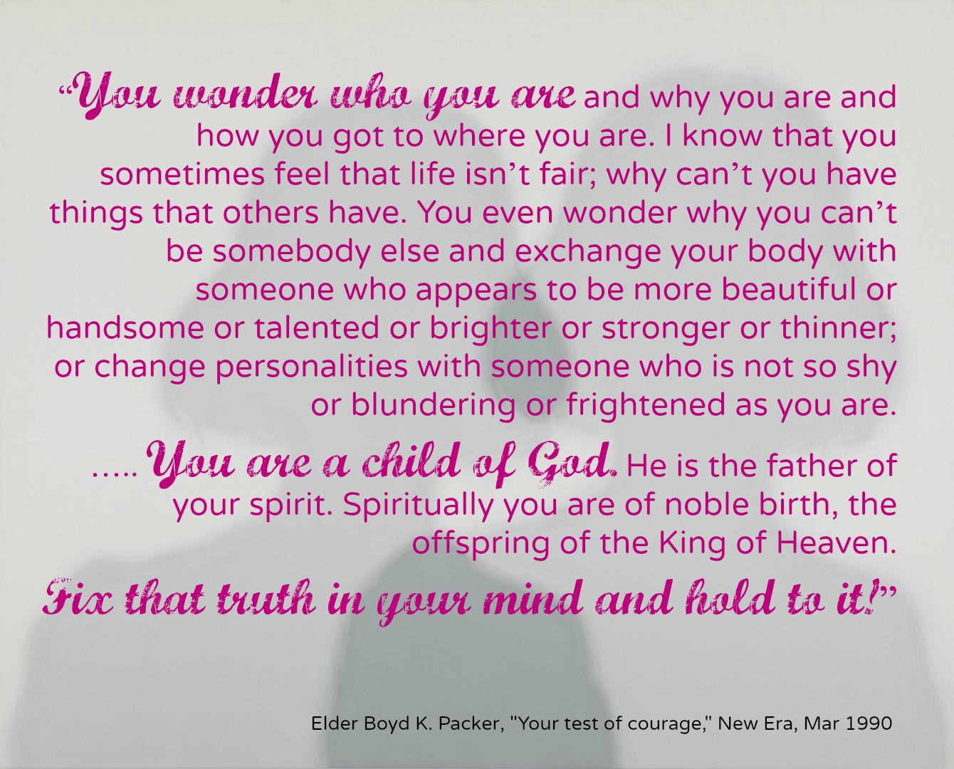 President Packer believed in the good of people, and he was an optimist. He acknowledged his own weaknesses often, but asserted that his testimony of the Savior was unwavering. I use this Elder Packer quote sometimes when I teach the youth because I think it’s a beautiful, clear reminder of individual worth.