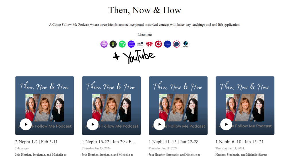 I’ve teamed up with dear friends, Heather B. Moore and Michelle Wilson, to do a Come Follow Me Podcast called Then, Now & How. Each week we study the Book of Mormon and come together to share our thoughts about historical context (Heather), related teachings by living prophets (Stephanie), and personal application (Michelle). Please join us and listen at any of the platforms indicated in the image, or follow along on YouTube.